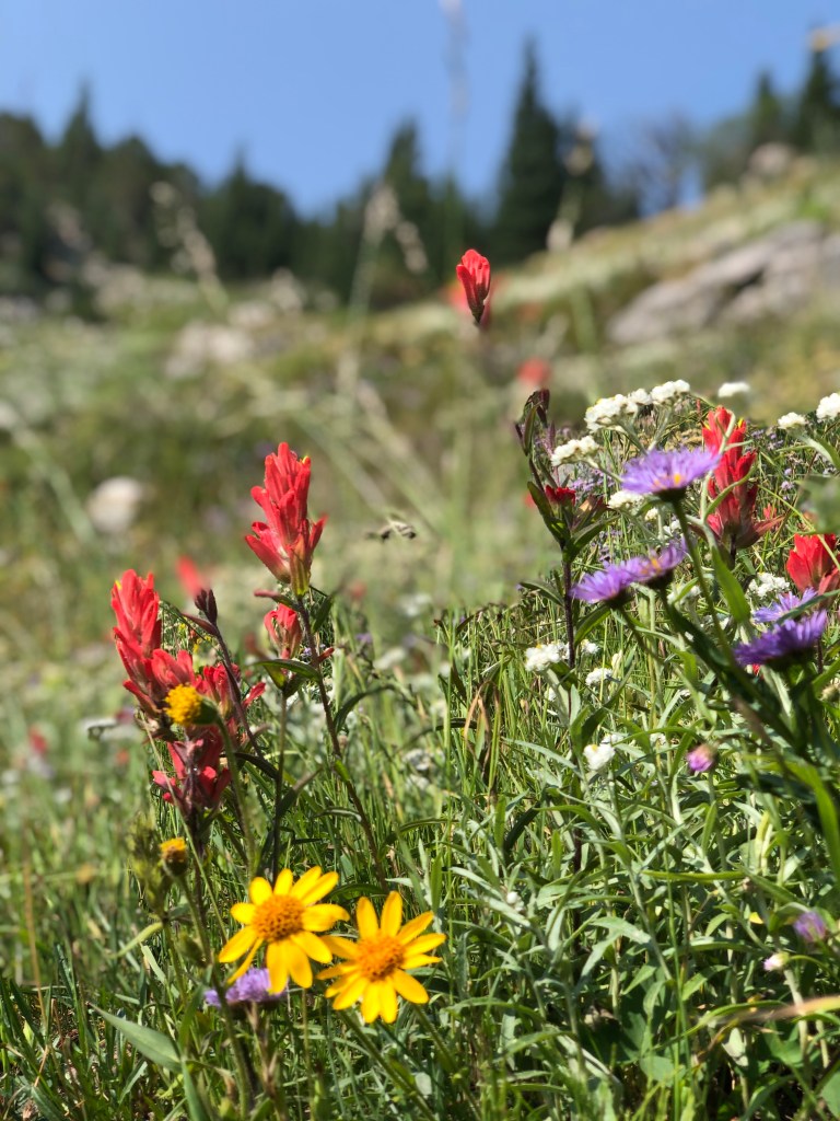 The lake isn’t huge, perhaps a mile around. But it really made for a pleasant hike in the evening and following morning, with the kids mainly using it as an opportunity to throw/skip rocks and climb on the large boulders that rise above the surface like little islands. Also, as we ventured to the more exposed, east-facing side of the lake, we encountered beautiful wildflowers clinging to the steep slope of the mountain. Harebell, Indian Paintbrush, Old Man of the Mountain sunflowers, Blanket Flower, Aster, Common Yarrow, etc. flanked both sides of the trail (disclaimer: I’m not a botanist, so don’t quote me on these varieties).