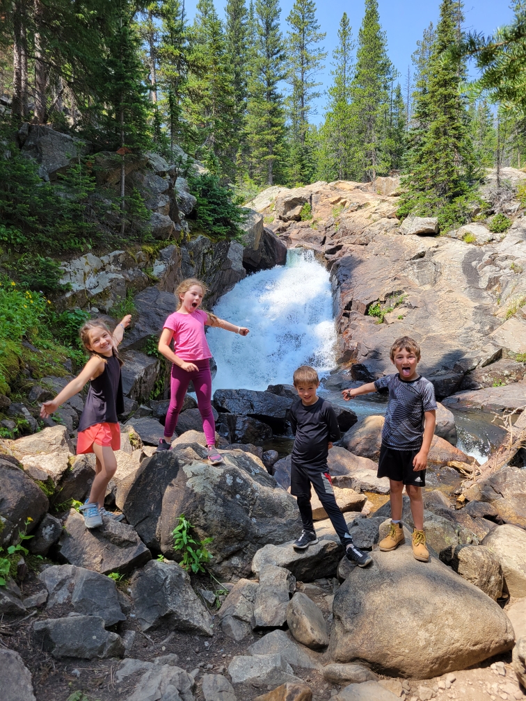 After about 2 miles, we gauged the “halfway” point as the first waterfall, which cascades down the rocky slope, before spilling over a cliff around 30 feet high. This served as the perfect picnic stop, with the sound of rushing water, refreshing mist, gorgeous vantage point and natural stone “seating” for the kids, as well as the shade provided by pines. There were others with the same idea, resulting in the trail being pretty busy, given it was a Saturday in Summer. It served as good people watching at least! Many of them tried to “boulder hop” across the river, just before the falls for the ideal photo opt…we witnessed at least one guy fall in the process. Luckily he was ok, but in my humble opinion, not worth the few likes on Instagram. Frankly it prompted a rich discussion around safety with our children–and what NOT to do.