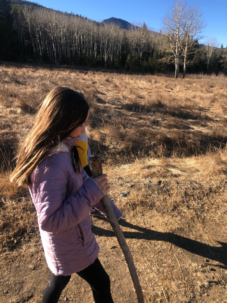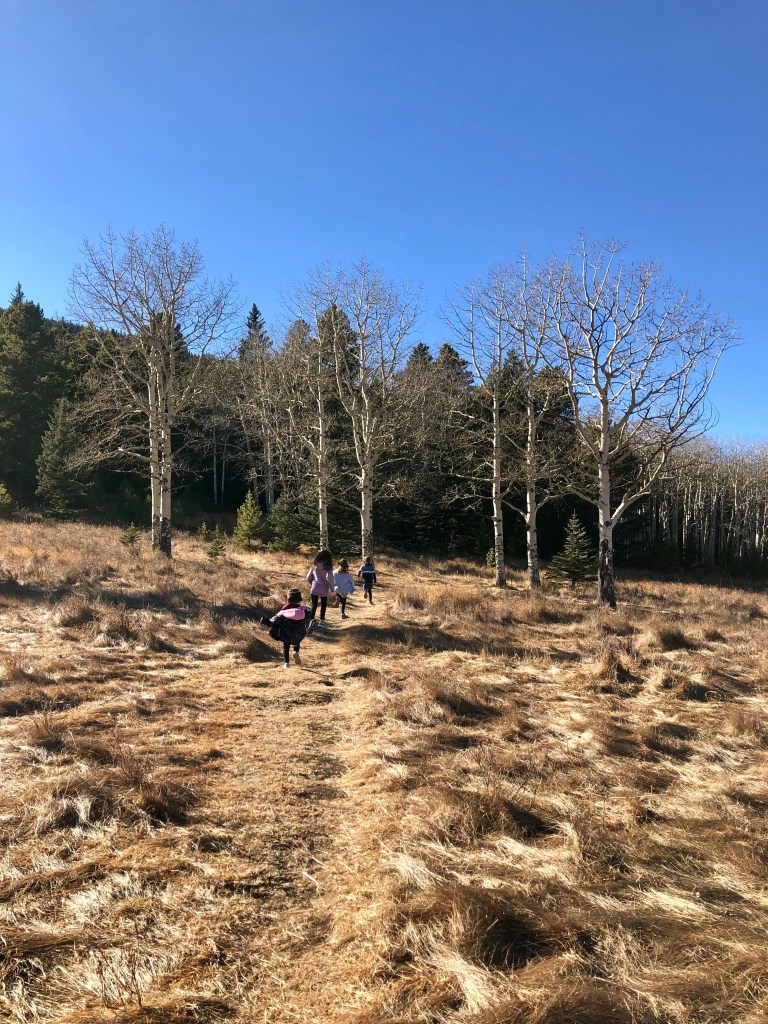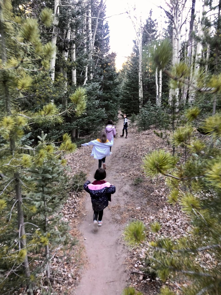 Well, with kids in tow, one can invariably count on a change of plans. With my 7-year-old “Adventure-Seeking Micah” trailblazing for us, those plans came extra quickly. Micah immediately took charge and led us about 1/4 mile in from the parking lot, then veered left, away from the main trail and onto to an intersecting one (which appears to have no name). An enchanting Aspen grove caught his eye, and the trail he hopped on led straight to it.