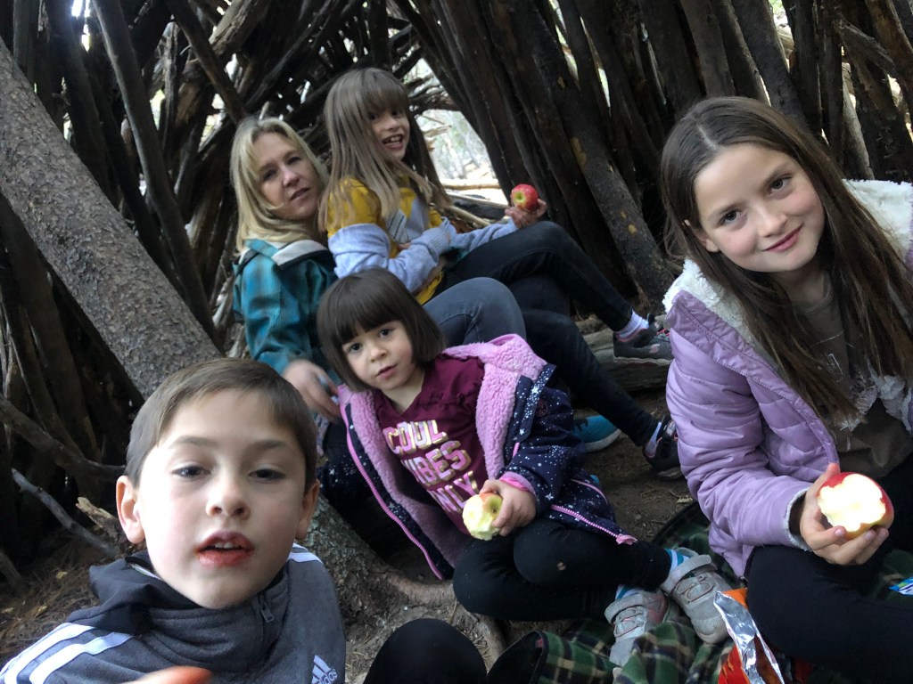 We do look forward to exploring this trail a little deeper and uncovering more surprises, lean-to or otherwise. But the daylight was quickly receding, as it tends to do early this time of year. So we turned around and headed back to their favorite lean-to (#4) for a picnic snack inside, before calling it a day…a very good & surprise-filled day!