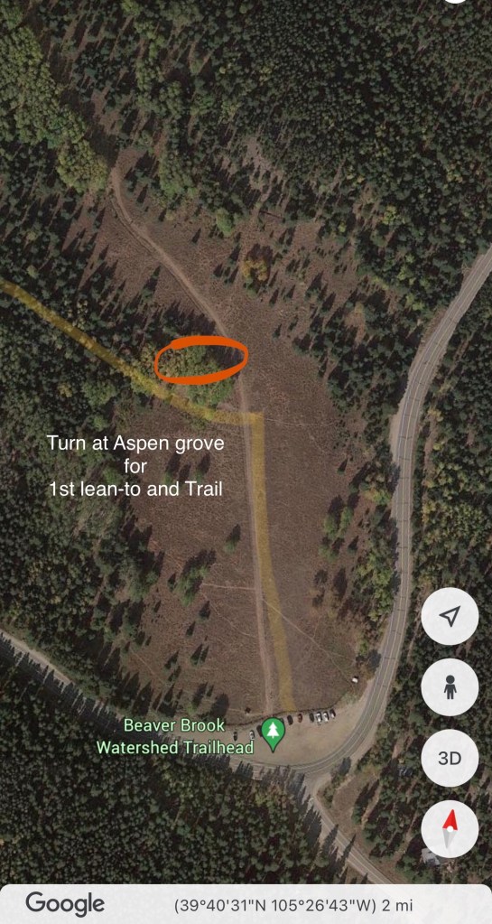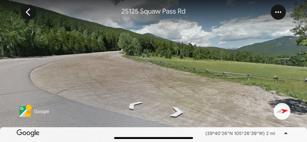 Directions to “Lean-To Hike” from Denver: Take I-70 West to CO-74 toward Evergreen Parkway (Exit 252). After approximately 3 miles, turn right on Squaw Pass Road. After about 3.5 miles start keeping an eye open for a dirt parking lot on the righthand side. There will be a long split-rail fence separating the parking lot from an expansive meadow where the trail begins. Note pictures below: